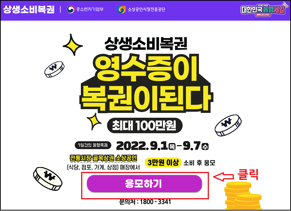 - 상생소비복권 홈페이지 첫 번째 화면에서 [응모하기] 클릭