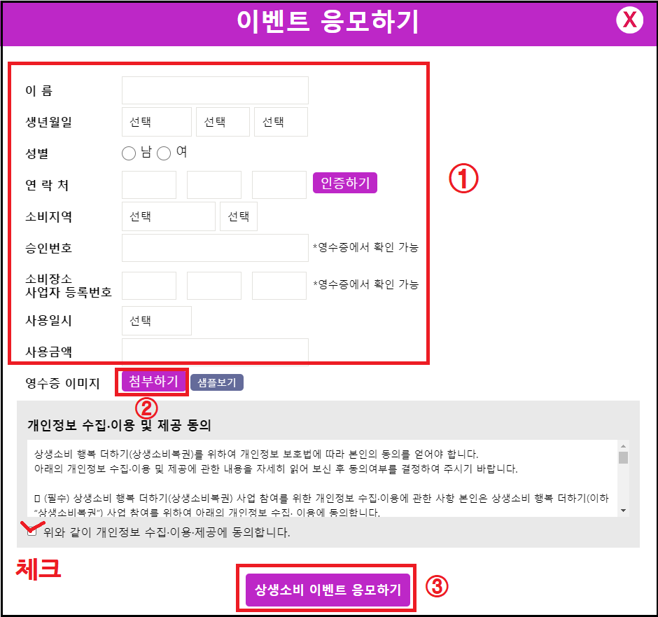- 개인정보 입력 - [첨부하기] 클릭해서 영수증 사진 업로드(카드 또는 현금영수증)