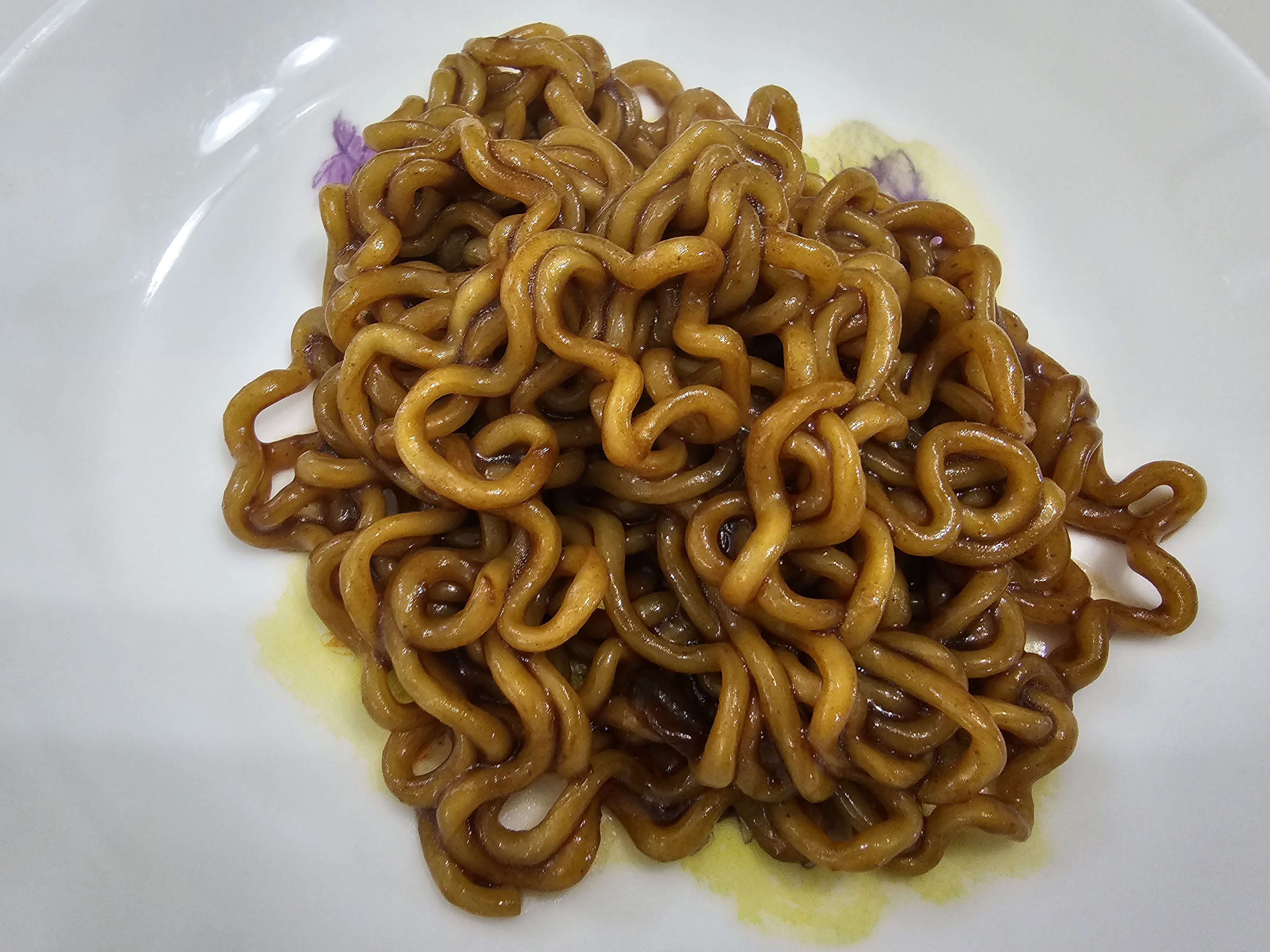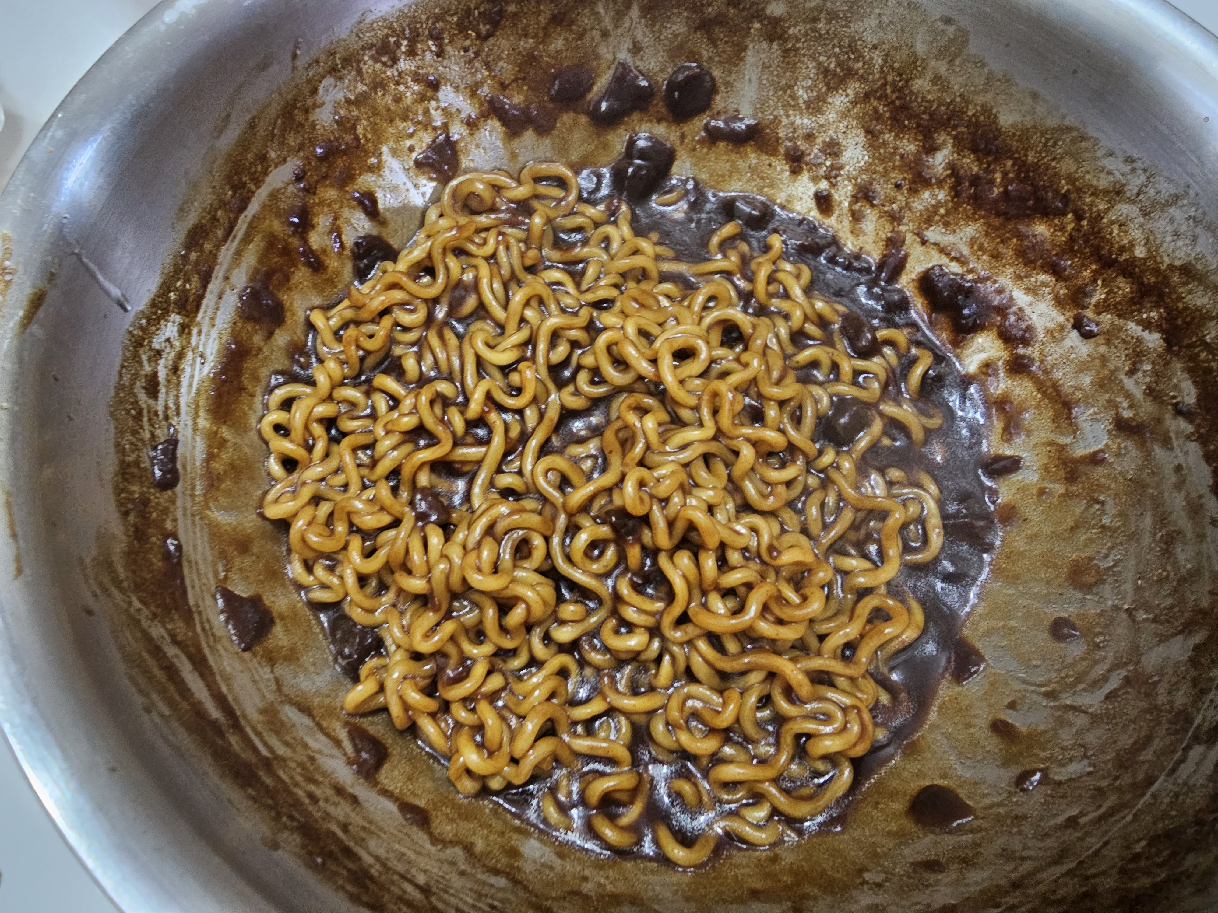3. 물을 한 스푼 정도 남기고 버린 후 면위에 짜장 수프를 부어 비빈다.