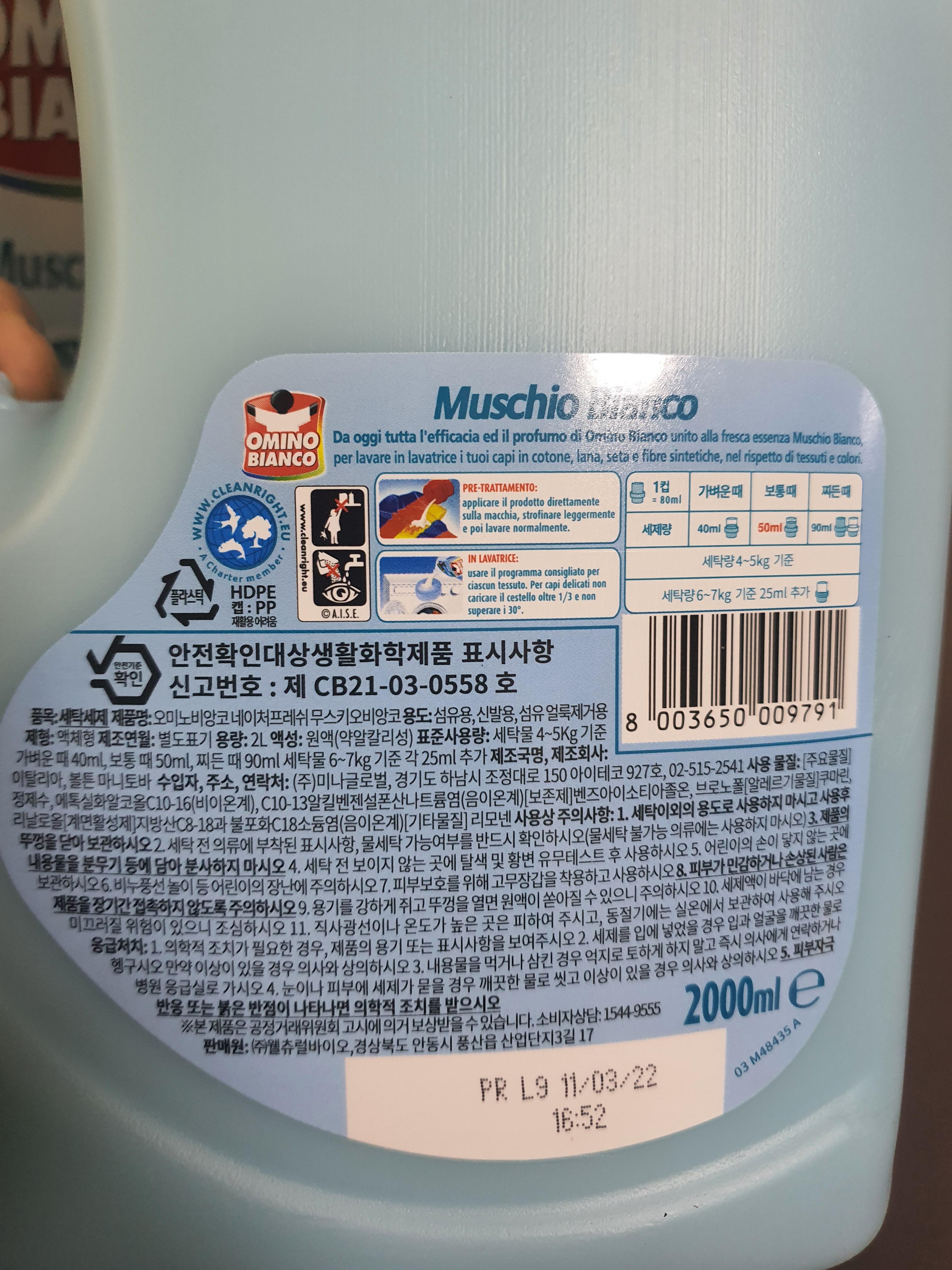 오미노비앙코 무스키오비앙코 일반드럼겸용 액상세제 화이트머스크향