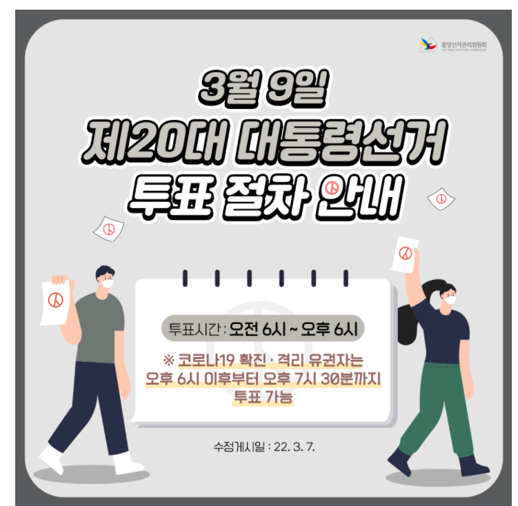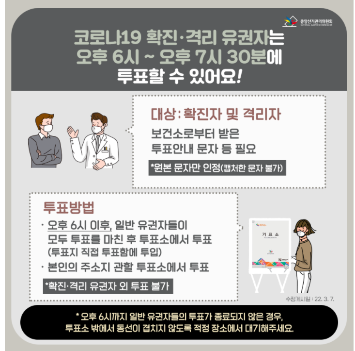 1. 투표시간 : 코로나19 확진·격리 유권자는 오후 6시부터 오후 7시 30분까지 투표 가능