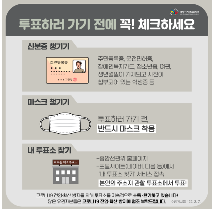 2. 준비 : 신분증, 보건소에서 받은 투표 안내 문자(원본 문자만 인정/ 캡처한 문자 불가)