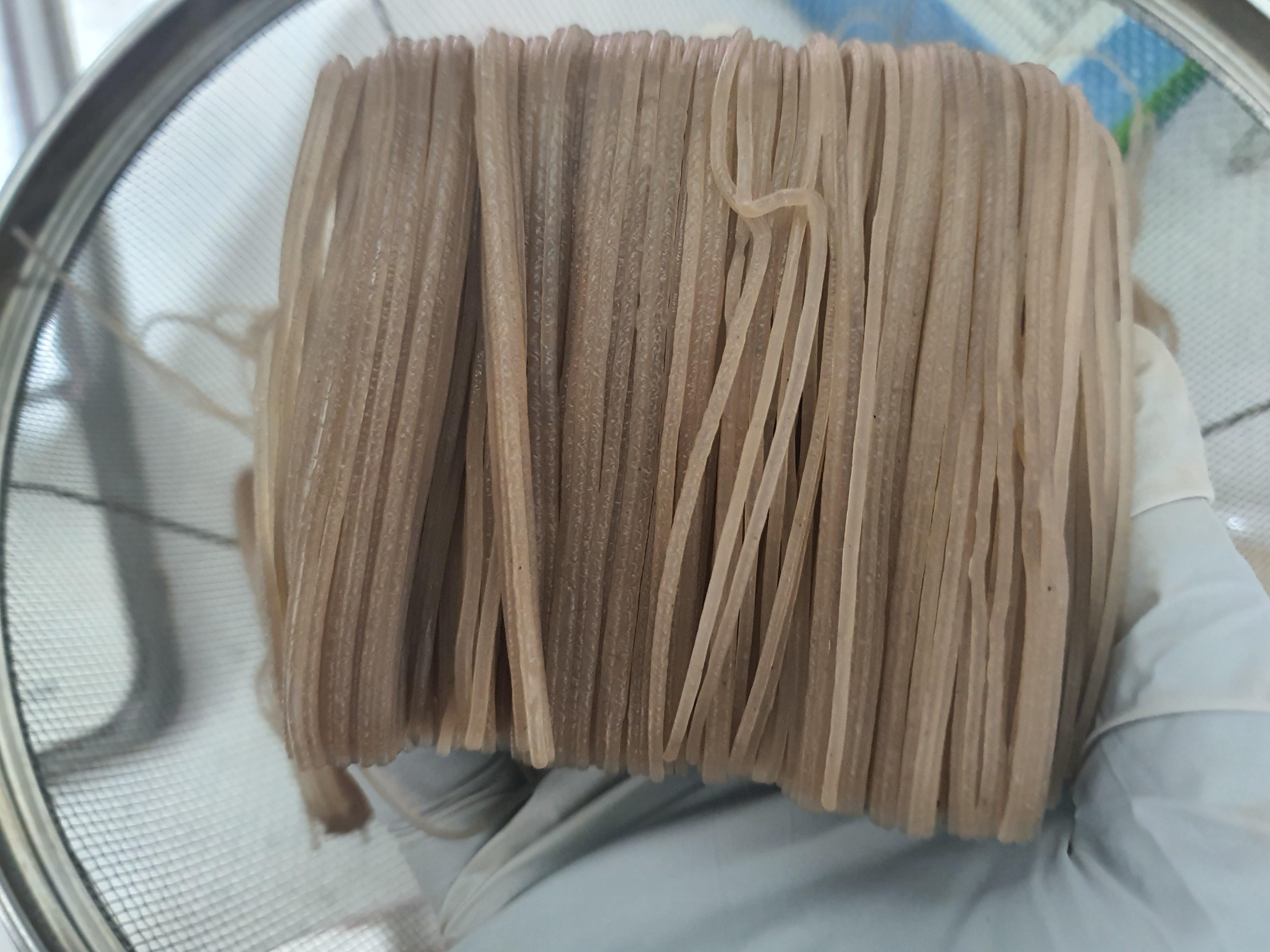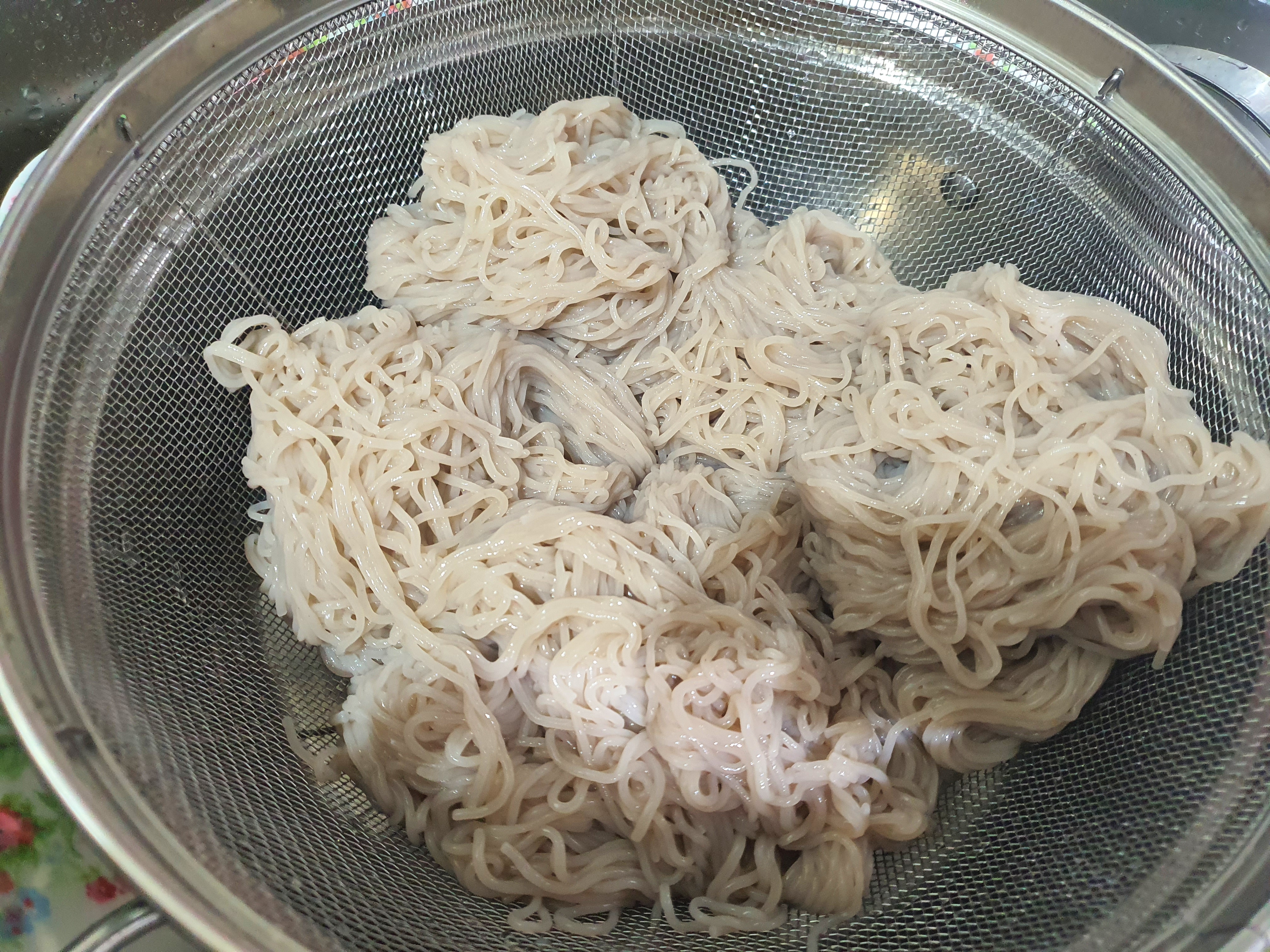 2. 면을 건져내어 흐르는 찬물에서 끈적임이 없어질 때까지 충분히 헹궈서 건진다.