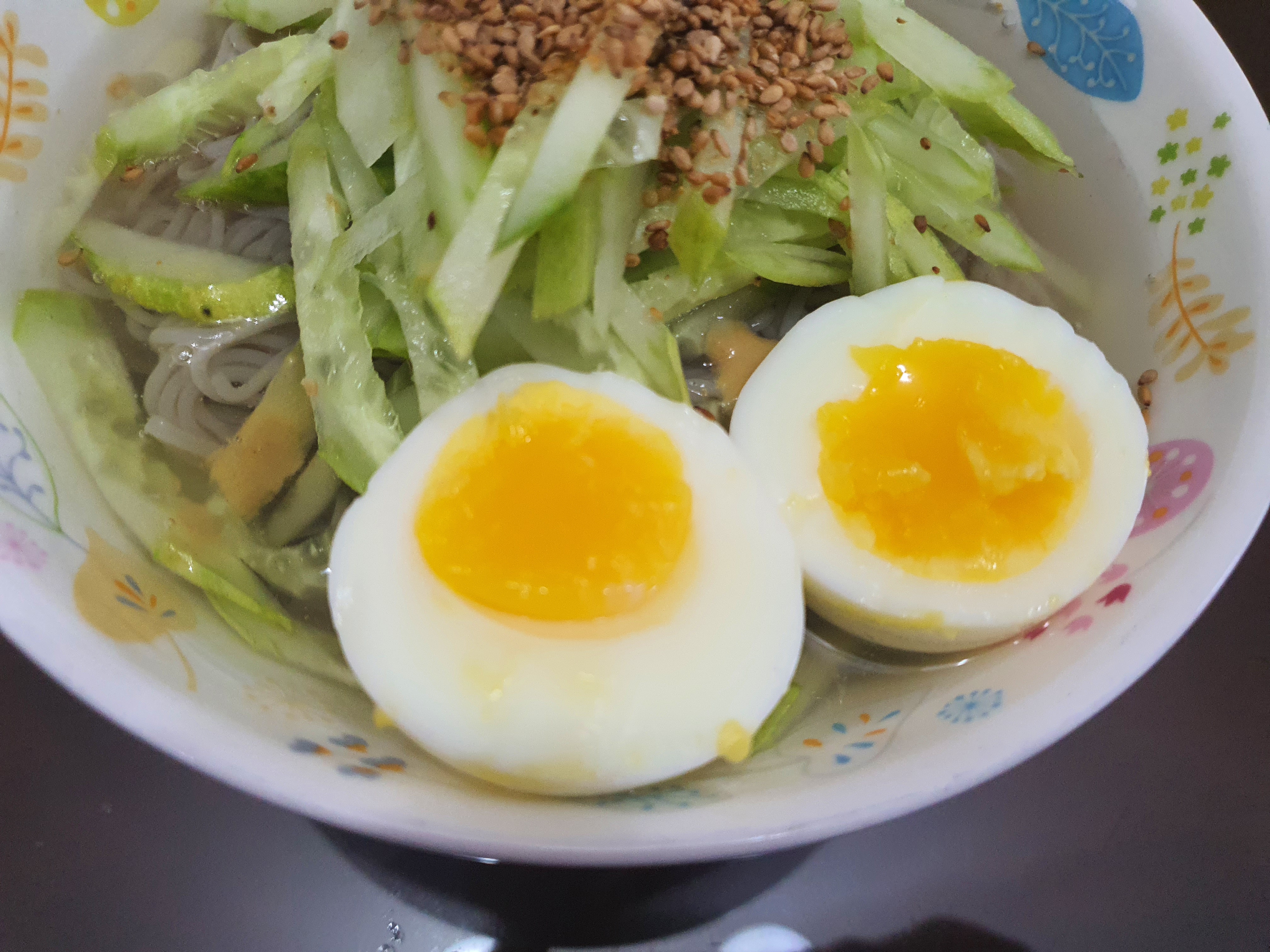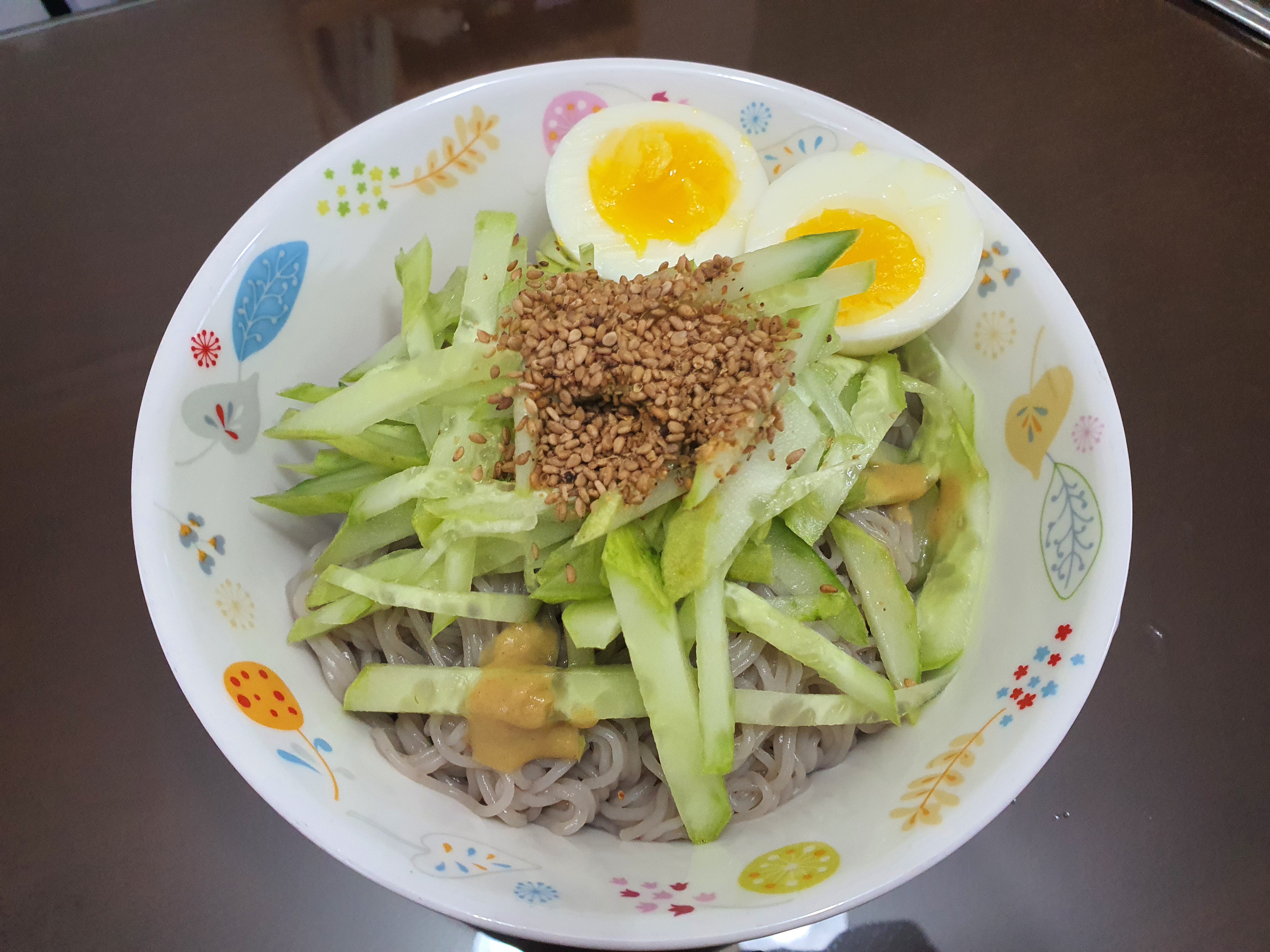 오이와 깨를 듬뿍 얹어서 먹으면 너무 맛있어요.